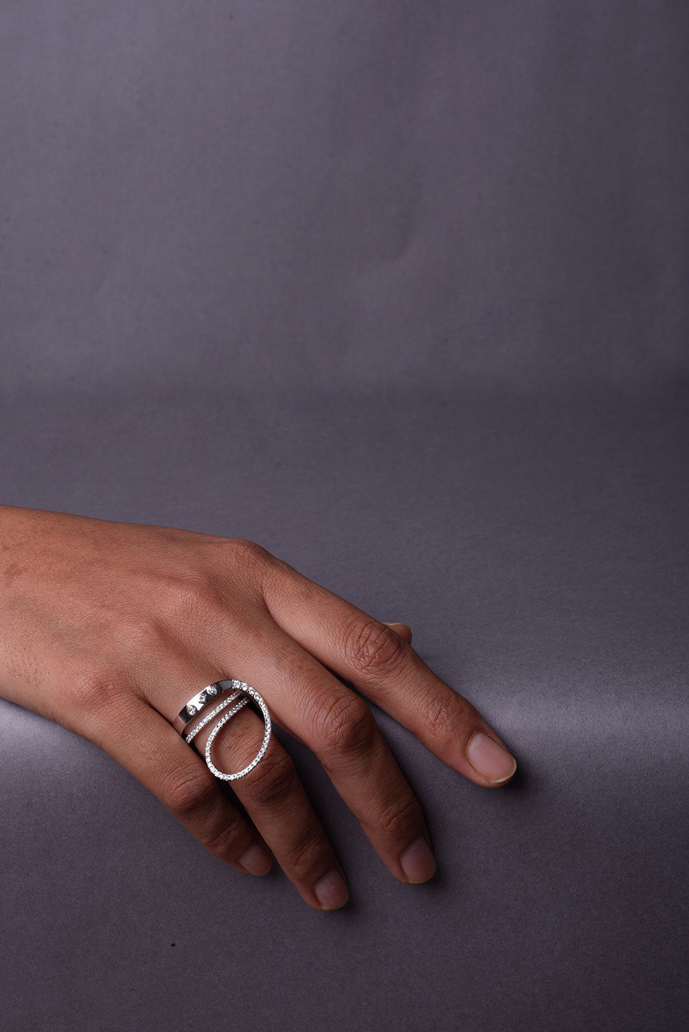 Allow us to introduce "Dusk," a mesmerizing ring that boasts a distinctive, artfully crafted design characterized by graceful curves and geometric intricacy, adorned with three captivating centre stones.
